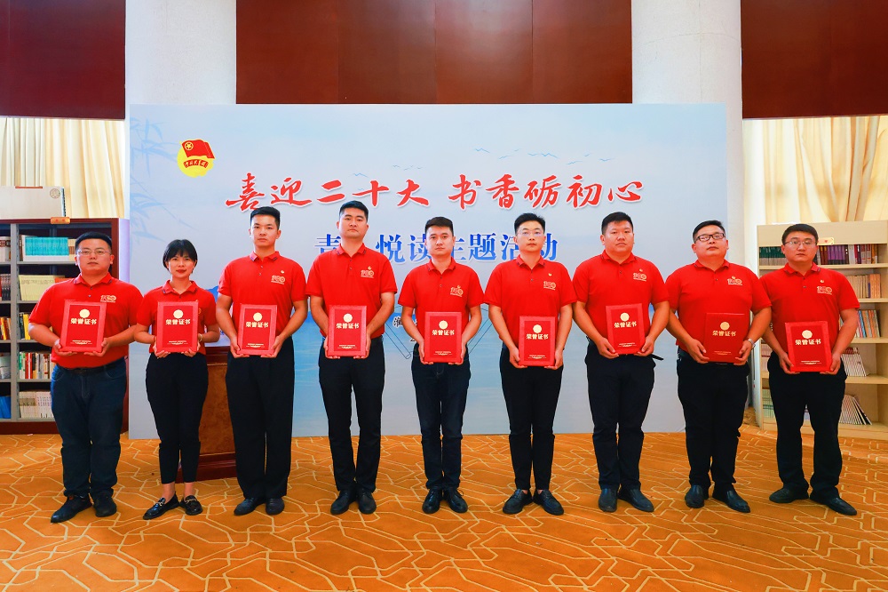 活動中,青年代表黃陳陳首先領學習近平總書記《論黨的青年工作》重要篇目—《廣大青年成長成才要勵志勤學、加強磨練》;3位青年代表依次上臺進行好書推薦,分享了個人讀書心得;4位青年代表共同誦讀了紅色經典作品《紅船,從南湖起航》;現場宣讀了青年大學習“十百千萬”行動評選結果,向2021-2022年“青年大學習”優秀組織單位及部分“學習標兵”代表進行了頒獎,并贈送了《論黨的青年工作》書籍和讀書卡。