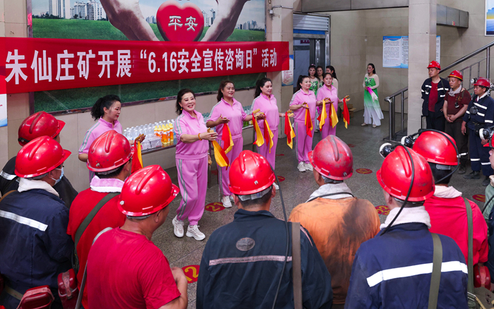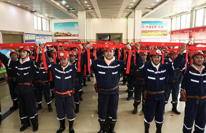 “安全生產(chǎn)月”中,桃園礦為每名礦工贈送了意寓著安全生產(chǎn)的紅腰帶,激發(fā)大家堅定安全“四零”目標。(陳敏奎 攝)
