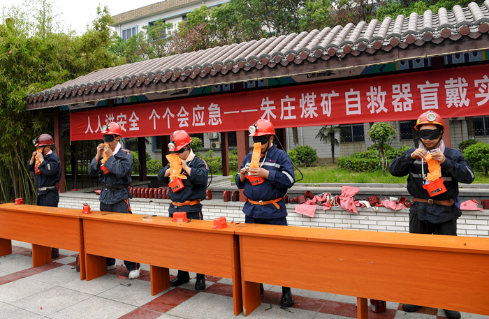 朱莊礦開展“自救器盲戴練兵”活動,確保職工遇到險情時能夠快速、準確、安全地使用自救器(張宗風(fēng) 攝)