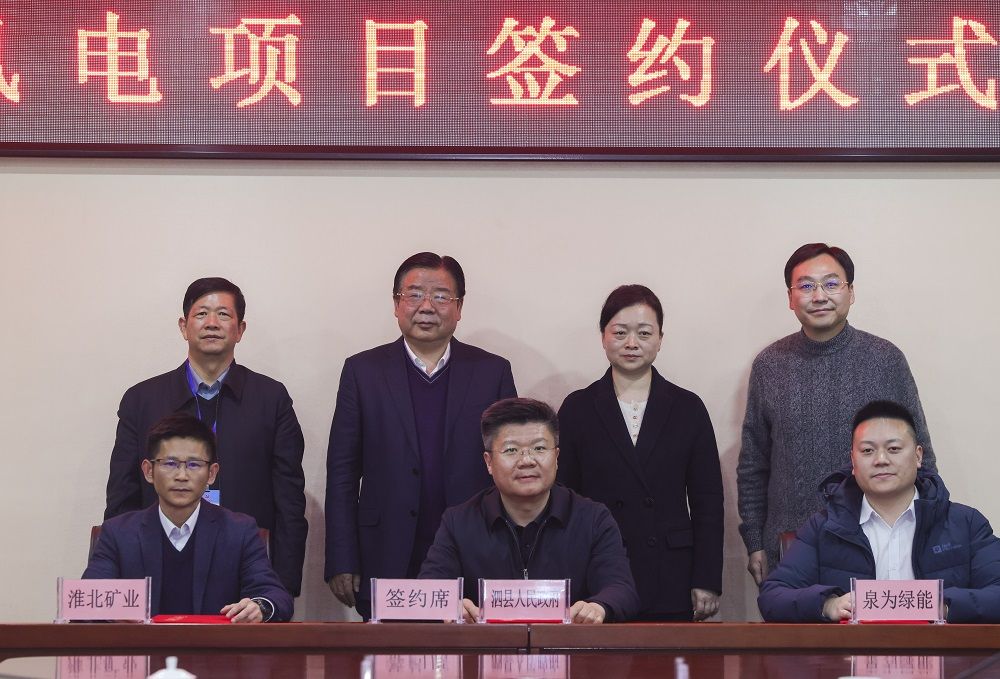 2月14日,淮北礦業集團與泗縣人民政府、泉為綠能投資(海南)有限公司舉行三方簽約儀式,順利簽約300兆瓦泗縣風電項目。淮北礦業集團黨委副書記、總經理孫方,淮北礦業副總經理陳亞東;泗縣縣委副書記、縣長王汝娜,縣委常委、副縣長王躍明,以及泉為綠能投資(海南)有限公司、上海贏古資產管理公司負責人出席了簽約儀式。