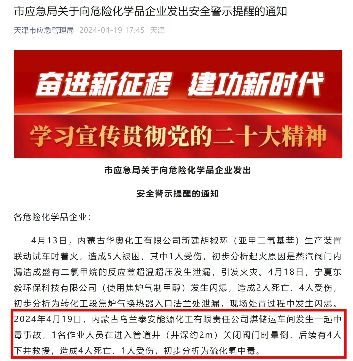 日前,天津市應急管理局向危險化學品企業發出的一則安全警示通知提到,4月19日,內蒙古烏蘭泰安能源化工有限責任公司煤儲運車間發生一起中毒事故,1名作業人員在進入管道井關閉閥門時暈倒,后續有4人下井救援。事故共造成4人死亡、1人受傷,初步分析為硫化氫中毒。