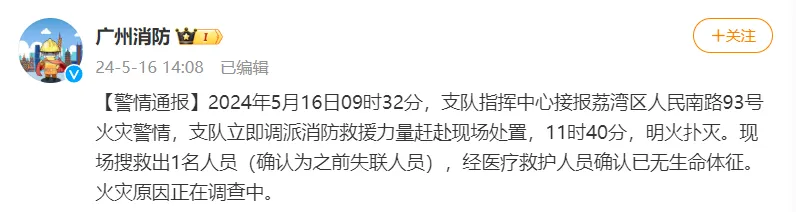 5月16日,廣東省廣州市荔灣區(qū)人民南路93號(hào)火災(zāi)警情,據(jù)廣州市消防救援支隊(duì)消息,截至當(dāng)日11時(shí)40分,明火已被撲滅。