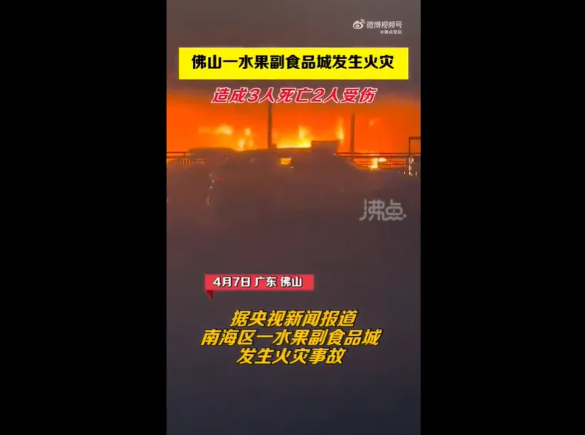 2022年4月7日凌晨1時(shí)許,廣東省佛山市南海區(qū)獅山鎮(zhèn)羅村華南水果副食品城發(fā)生火災(zāi)事故。事故共造成3人死亡,2人受傷。