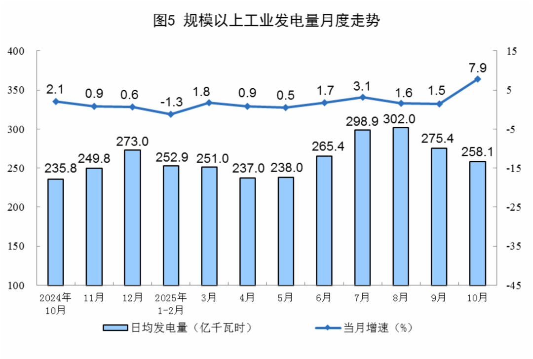 10月份,規(guī)上工業(yè)發(fā)電量8002億千瓦時(shí),同比增長(zhǎng)7.9%,增速比9月份加快6.4個(gè)百分點(diǎn);日均發(fā)電258.1億千瓦時(shí)。