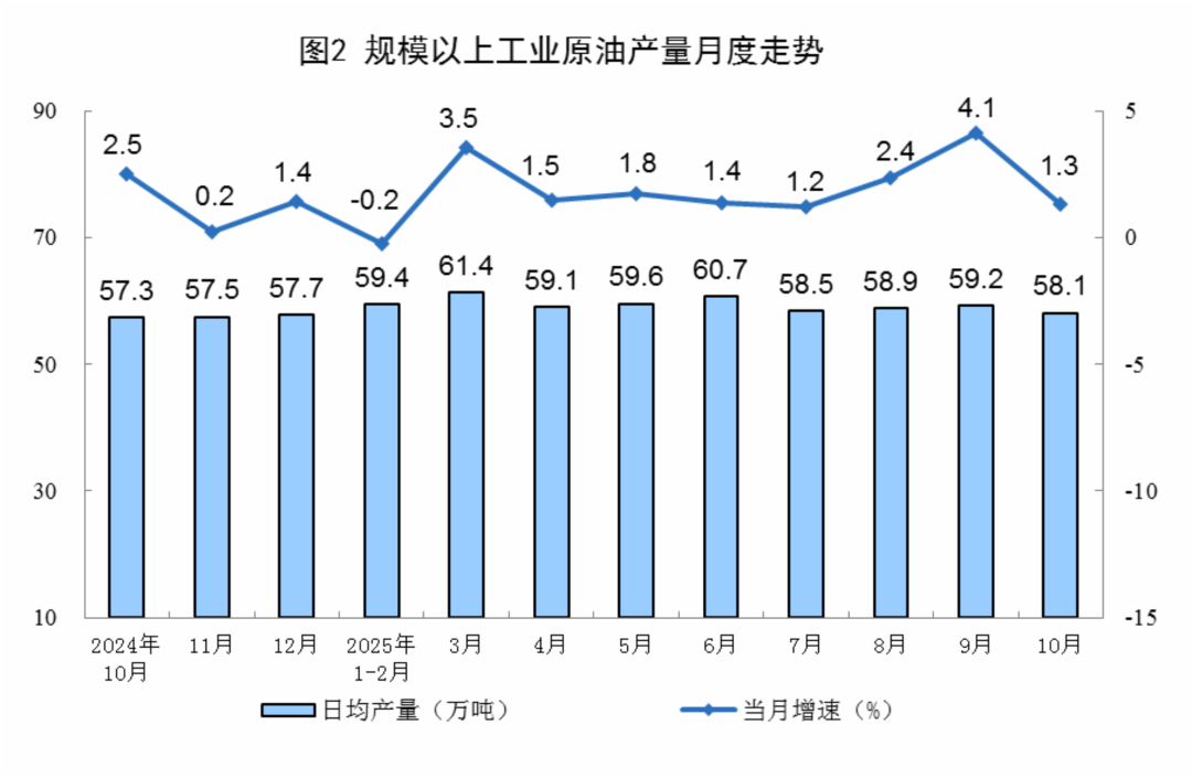 原油生產(chǎn)保持增長(zhǎng)。10月份,規(guī)上工業(yè)原油產(chǎn)量1800萬(wàn)噸,同比增長(zhǎng)1.3%,增速比9月份放緩2.8個(gè)百分點(diǎn);日均產(chǎn)量58.1萬(wàn)噸。1—10月份,規(guī)上工業(yè)原油產(chǎn)量18064萬(wàn)噸,同比增長(zhǎng)1.7%。原油加工平穩(wěn)增長(zhǎng)。10月份,規(guī)上工業(yè)原油加工量6343萬(wàn)噸,同比增長(zhǎng)6.4%;日均加工204.6萬(wàn)噸。1—10月份,規(guī)上工業(yè)原油加工量61424萬(wàn)噸,同比增長(zhǎng)4.0%。
